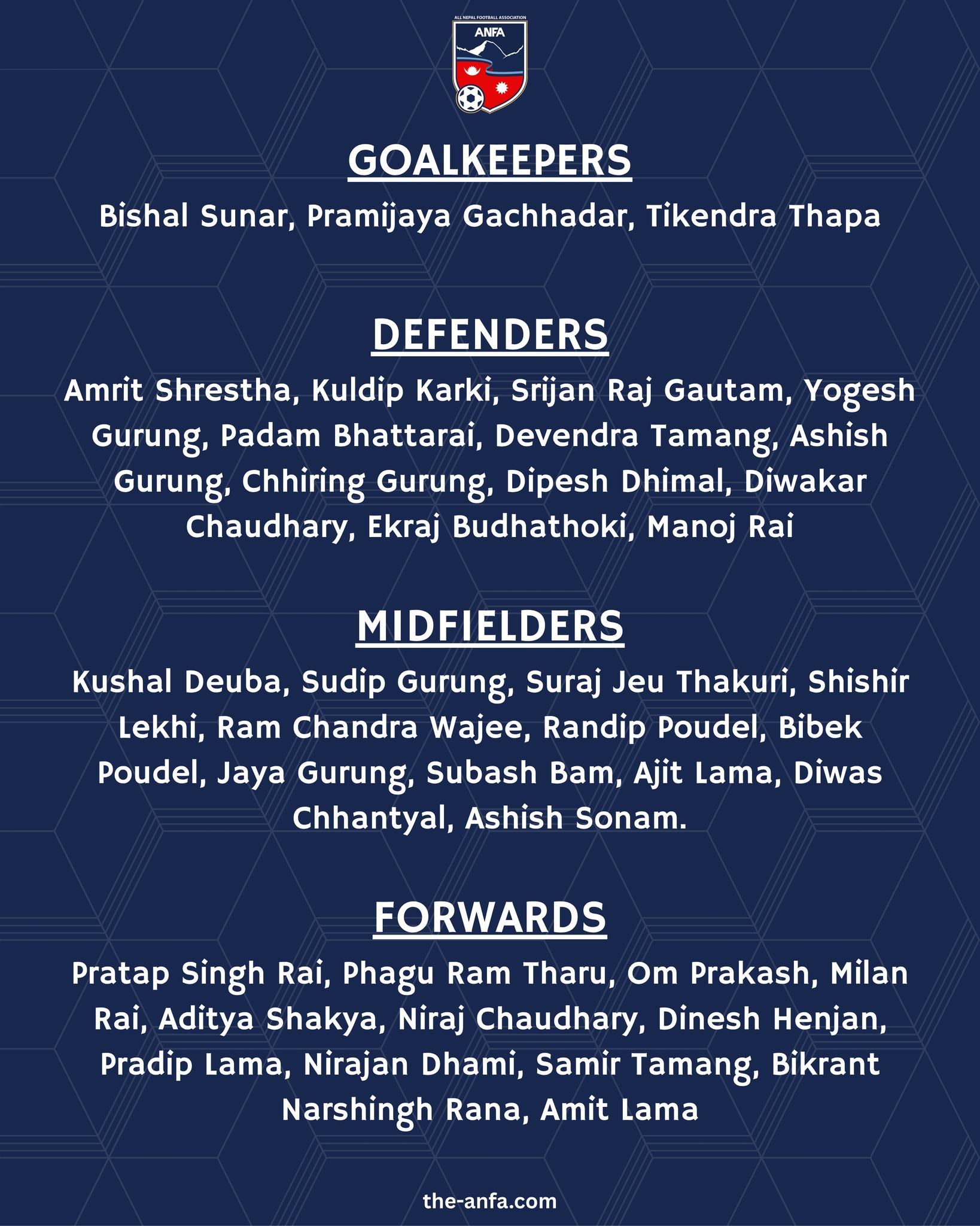 अखिल नेपाल फुटबल संघ एन्फाका अनुसार छनोट आइतबारदेखि मंगलबारसम्म हुनेछ। त्यसमा छनोट हुने खेलाडीलाई राष्ट्रिय टोलीको प्रारम्भिक टोलीमा समावेश गरिनेछ।