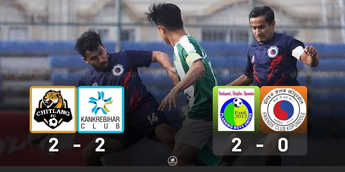 काठमाडौं। राष्ट्रिय लिगअन्तर्गत बुधबार दुई खेल सम्पन्न भएका छन्। सातदोबाटोस्थित एन्फा कम्प्लेक्समा सम्पन्न खेलमा काक्रेबिहार युथ क्लब र चित्लाङ एफसी २–२ गोलको बराबरीमा रोकिए भने प्लानिङ ब्वाइज युनाइटेडले फ्रेन्ड्स क्लबलाई २–० ले पराजित गरेको छ।