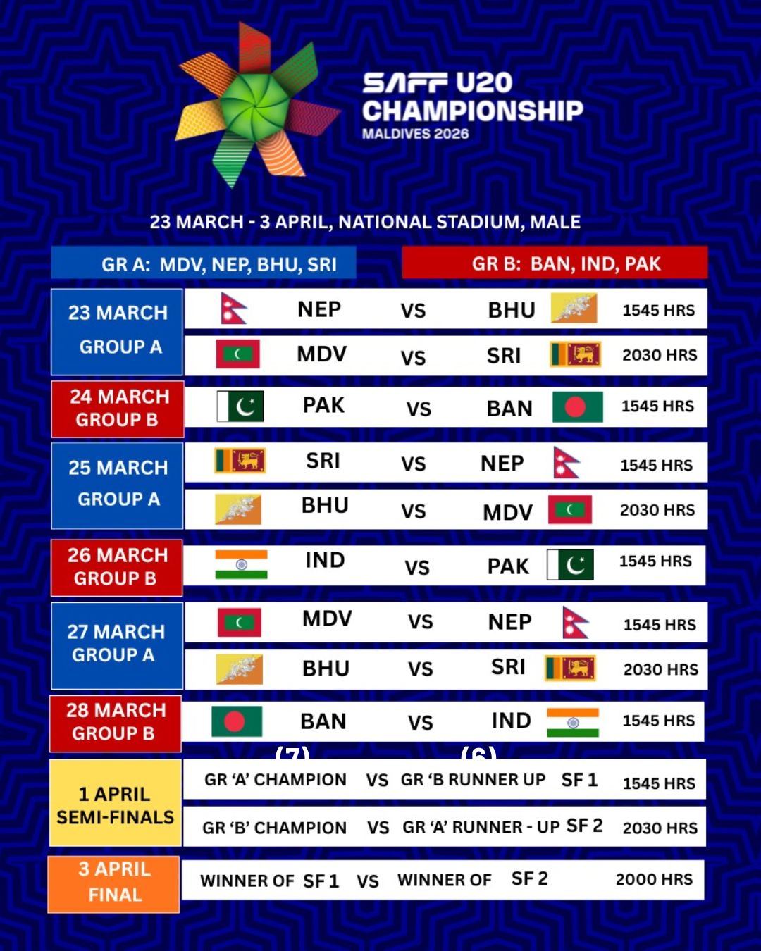 नेपाल समूह ‘ए’ मा रहेको छ। यस समूहमा आयोजक माल्दिभ्स, श्रीलंका र भुटान रहेका छन्। नेपालले दोस्रो खेल चैत १२ गते श्रीलंकासँग खेल्नेछ भने समूह चरणको अन्तिम खेल चैत १४ गते माल्दिभ्ससँग हुनेछ।